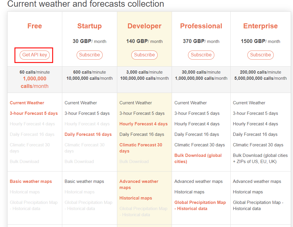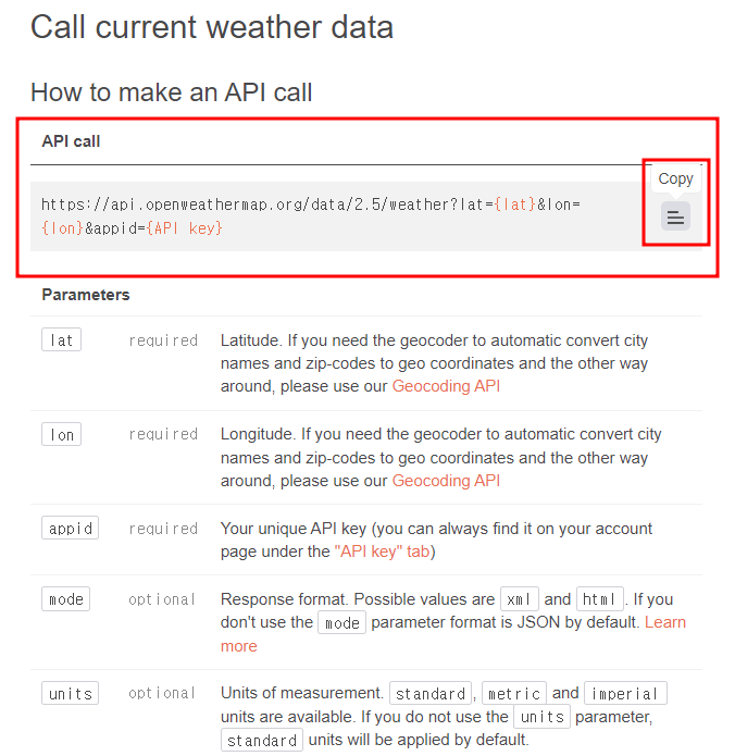 그리고 현재 날씨 데이터를 받아오는 API를 사용하기 위해 스크롤은 조금 내려 Current Weather Data 항목을 찾습니다.