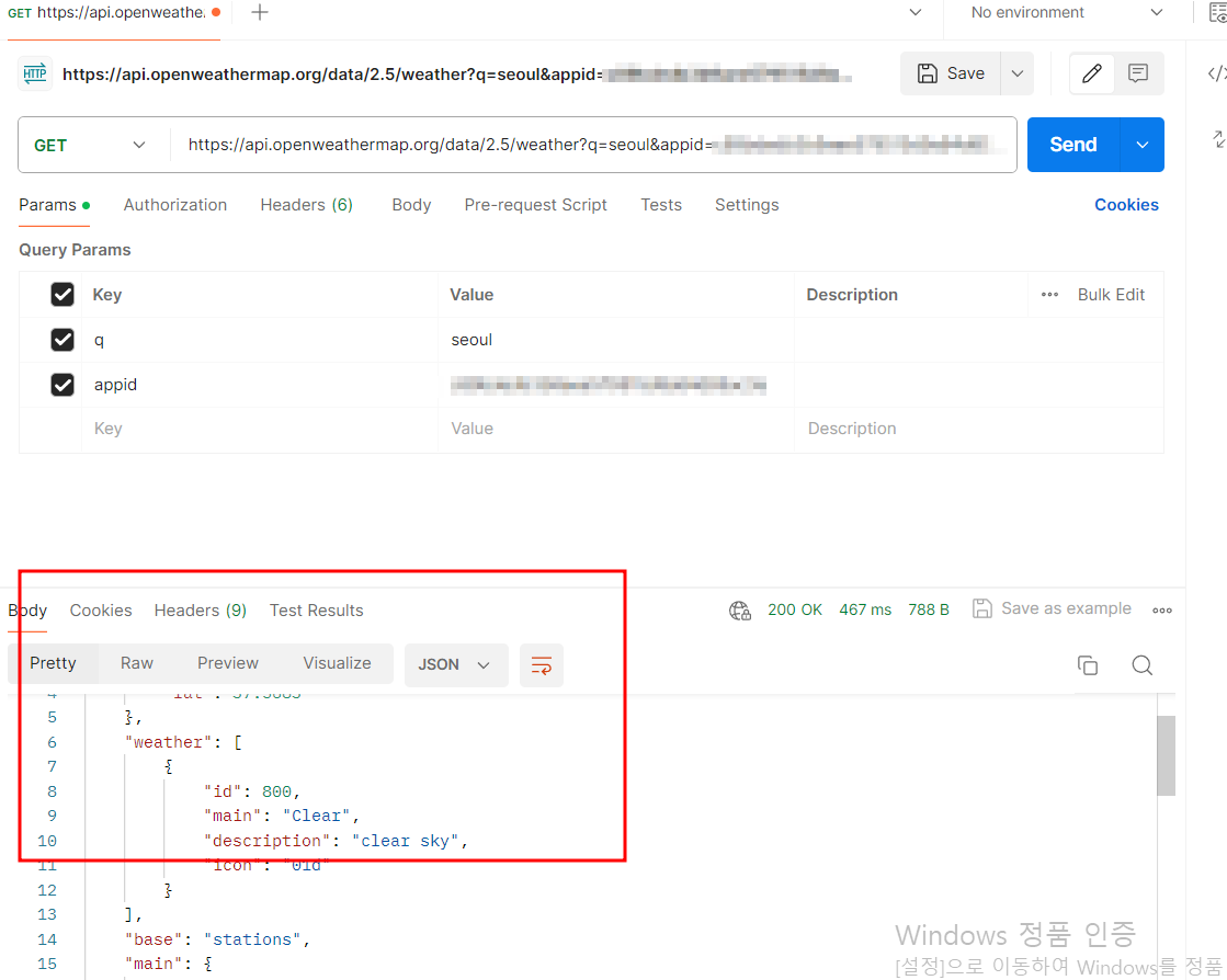 그리고 API호출 시 파라미터가 2개 필요한데 q=seoul (도시이름), appid=shjdhsa82h1hd7h317d (4번에서 생성한 API key)를 넣어줍니다.