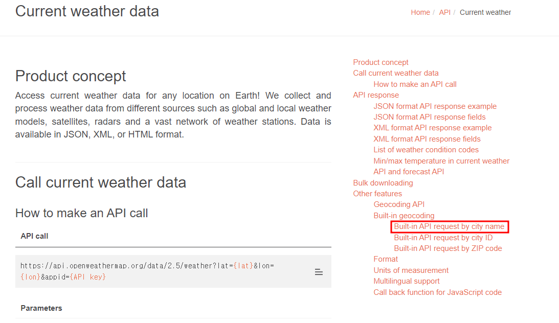 6. 현재날씨 데이터를 도시이름으로 검색해서 가져오는 API를 사용하기 위해 우측의 Built-in API request by city name 링크를 클릭해서 해당 항목으로 이동합니다.